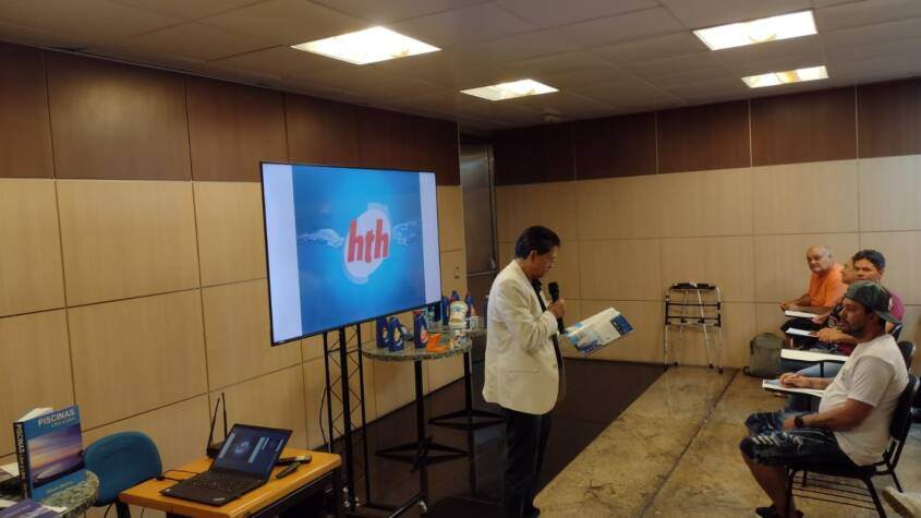 Neste dia o Sr Forlenza “Dr Piscina” explicou e ensinou sobre o uso dos diversos produtos da hth para o tratamento de piscina e também como fazer e o porque de diversas situações que ocorrem na limpeza da água da piscina.