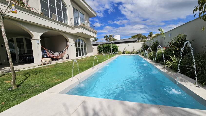 Temos em nosso portfólio piscinas de baixa e alta complexidade como de resorts, parque aquático, complexos turísticos em SC, condomínios residenciais, construtoras, enfim. Temos todo know-how e experiência para fazer piscinas com grande complexidade. Fizemos em 2004 uma piscina gigante na residência do Ronaldinho Gaúcho, em Porto Alegre, onde levamos de Florianópolis uma bola de futebol enorme em fibra, com uma taça em cima que serve de chafariz (esse projeto deu trabalho!)
