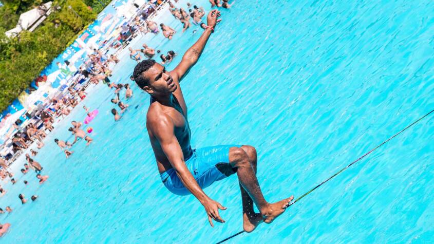Neste esporte precisa de um fita resistente presa nas bordas da piscina, onde os participantes tem que se equilibrar em cima da fita. É um esporte difícil mas gostoso de se