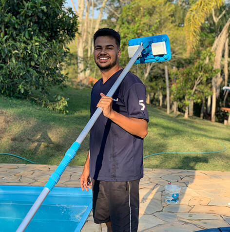 Resp: “Usamos bastante acessórios como o aspirador para aspirar o fundo da piscina, as escovas para soltar a sujeira, peneira para retirar resíduos maiores da piscina, cabos de alumínio e nossa bomba externa para limpar piscinas que por algum motivo, a bomba não está funcionando ou não tem.